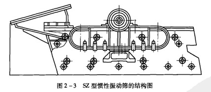 圖2-3和圖2-4分別是sZ型慣性振動(dòng)篩的外形圖和工作原理示意圖。從圖中可以看出,這種篩子有8個(gè)主要組成部分,其中篩網(wǎng)固定在篩箱上,篩箱安裝在兩個(gè)橢圓形板簧上,板繭底座固定在基礎(chǔ)上,偏重輪和皮帶輪安裝在主軸上,重塊安裝在偏重輪上。改變重塊在偏重輪上的位置,可以得到不同的離心慣性力,以此來(lái)調(diào)節(jié)篩子的振幅。主軸通過(guò)兩個(gè)滾動(dòng)軸承固定在篩箱上。篩箱一般呈15°―25°傾斜安裝,以促進(jìn)物料在篩面上向徘料端運(yùn)動(dòng)。